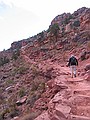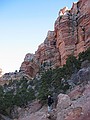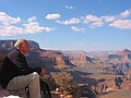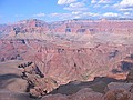 woensdag 30 oktober 2002Het is 12 uur en we eten een boterham met kaas. En dat dat doen we op Skeleton point. Het uitzicht is fabeltastisch. We kijken de Canyon in de langsrichting in en zien de Coloradoriver stromen met af en toe wat rappids. Zo ver het oog rijkt zien we de Canyon walls optijzen van ver onder ons naar ver boven ons. Je leest het goed, we zijn een heel eind de Canyon in getrokken. Het punt waar we nu zitten ligt 617 meter lager dan de South rim en 3,23 km daar vanaf. Deze plek heet Skeleton point en ligt aan het Kaibab trail. Vanochtend zijn we na het klaarmaken van wat bruine boterhammen met kaas op de bus gestapt. Er rijden in the village gratis bussen die je met gemak van de ene plek naar de andere brengen. Je komt er zelfs op plekken waar je anders niet kunt komen; de auto heeft hier geen vrije toegang meer. Bij het visitors center stappen we over en even later zijn we bij het South Kaibab trailhead. Even voor tienen dalen we af de Canyon in naar het eerste punt. Dit heet heel toepasselijk het Ooh Aah point want ineens krijg je een enorm uitzicht naar het oosten. Vervolgens verder afdalend komen we bij Cedar ridge. Bij Cedar ridge nemen we wat meer pauze en kijken ondertussen naar groep muilezels die een aantal toeristen bovenbrengt. Een andere groep muilezels gaat met zakken beladen naar beneden. Wanneer we verder afdalen komen we er achter wat deze doen: er wordt gewerkt aan het pad. De dieren brengen zakken met materiaal naar 2 mannen die bezig zijn het pad te herstellen. Zeker geen overbodige luxe want soms zijn de stappen die we moeten nemen groter dan 3 traptreden. Skeleton point ligt op 1599 m hoogte (vlgs. de gps) en over de trip naar beneden deden we totaal 2 uur. Na een uurtje maken we ons op voor de klim terug. Druk is het niet onderweg. Een aantal hikers daalt verder af naar de rivier om daar de nacht door te brengen, andere gaan net als wij terug. Al met al komen we zo'n kleine 20 hikers tegen. Die terugreis is zeker niet gemakkelijk en we nemen diverse pauzes onderweg. Na 2 uurn 20 minuten zijn we terug bij het startpunt op 2216 meter. Voor Andreh had het niet verder gehoeven, maar het geeft wel een voldaan gevoel. Op deze manier beleef je de Grand Canyon pas echt. De bus brengt ons weer terug en onderweg doen we nog wat boodschappen. Thuis in de Thunderbird lodge lekker douchen, een glaasje wijn en daarna even eten. Dat eten doen we in het cafetaria van Maswik lodge. Een leuke ruimte aangekleed met indiaans icons. Ook deze keer brengt de bus ons weer terug.