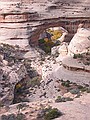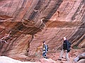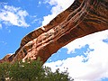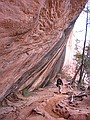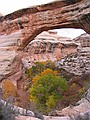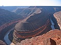 vrijdag 1 november 2002Het heeft wel wat om op te staan in een houten cabin, de buitendeur open te doen en dan direct in de zon op straat te staan. En wat voor straat. Zo'n eentje die je alleen maar in Amerikaanse films ziet. Aan de ene kant een half vervallen pompstation, aan de andere kant een enkele shop met kapotte neon en dan ons hotel. De weg loopt er dwars doorheen en een passerende vrachtwagen is gehuld in een wolk van stof. We gaan op stap en staan al snel voor de naamgenoot van het plaatsje: Mexican Hat. Een diep rode kei die ballanceert op een veel kleinere en ver boven het landschap uitsteekt. Niet hopen dattie valt want dan is het bestaansrecht van het plaatsje ook meteen nul. Direct daarna rijden we naar Goosenecks State park waar de San Juan rivier zich door het landschap meandert. Ons uitzichtpunt bevindt zich zo'n 300 meter boven de rivier. Het volgende punt op onze rit is The valley of the Gods. Een soort verkleinde uitgave van Monument Valley. We kunnen er echter niet ver in doordringen omdat de onverharde weg en onze rental niet zo goed met elkaar overweg kunnen. We kwamen nog wel langs de prachtig gelegen B&B maar die was (off season) gesloten. We vervolgen onze route over de 261 en rijden ogenschijnlijk recht op een stijle bergwand af. Borden waarschuwen ons voor een helling van 10% en een onverharde weg. Spectaculair, zoals we naar boven gaan. In no time zien we de B&B ver onder ons in de verlaten vallei staan. De 261 komt uit op de 95, die we eerst even westelijk rijden, naar Natural bridges national monument. Hier gaan we weer hiken naar 2 van de 3 natuurlijk gevormde Bridges. De klim omlaag is meer dan 100 meter en soms moeten we zelfs d.m.v. ladders langs stukken rotswand afdalen. Eenmaal beneden zie je pas hoe groot het allemaal is. De bedding laat ook zien dat het hier soms behoorlijk kan spoken. Geen wonder dat die rotsen zo uitslijpen. Na een lunch met bruin brood en . . . kaas natuurlijk, gaan we verder via de 95 richting het oosten. Deze weg met als naam ScenicByway(.net) geeft aan alle kanten prachtig zicht op rotsformaties, kloven en soms vlaktes met Junipers en ('t is herfst tenslotte) geel gebladerde bomen. De aansluiting op de 191 brengt ons verder naar het noorden. ook deze weg wordt weer geflankeerd door de ondertussen bekende rode rotsen van Utah. In Moab pakken we weer een motel. In Moab zelf eten we in het slickrock cafe en gebruiken daar ook even het internet om het thuisfront te berichten.