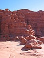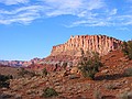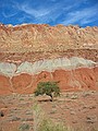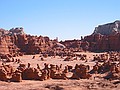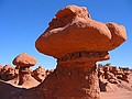 zondag 3 november 2002Het is vandaag zondag, een mooie dag voor familie bezoek. Terwijl de meeste Amerikanen daar een stukje (een paar 100 miles vinden ze niet gek) voor gaan rijden gaan wij op pad van Moab naar Capitol Reef en bezoeken wij onderweg Goblin valley. De rit voert ons eerst langs de diep rode rotsen waar Arches nat. park uit opgebouwd is. Snel daarna slaan we af de Interstate 70 op en het landschap verandert in Leeg. Rond de weg vele kilometers niets en verderop wat bergketens. Wanneer we weer afslaan de highway 24 op wordt het nog erger. Niet alleen het landschap is kaal maar zelfs de weg is leeg. Werkelijk 1 lang lint asfalt, tientalle miles lang. In de verte een paar bergpieken met sneeuw. Dit zijn dezelfde als we gisteren vanuit Arches zagen. Ze staan nu alleen op 80 km! afstand. Halverwege de 24 slaan we af naar Goblin Valley. Een verzameling bruine/rode keien balancerend op zachte klei. Door de vormen zijn het net figuren van dieren en gedrochten. We dalen af de valley in maar de kou dwingt ons na niet al te lange tijd terug te gaan. De wind snijdt door je heen. Na de 24 komen we weer op de 95 (ScenicByway) terecht waar we een paar dagen geleden ook al op reden maar dan meer oostelijk. Uiteindelijk rijden we Capitol Reef binnen. Bij het visitor center halen we wat info op een doen vervolgens de scenic drive. Deze rit laat je vanuit de auto, met een begeleidend schrijven, in kort bestek de gehele geschiedenis van het Reef zien. Hierna zoeken we een motel op. We slaan de eerste over omdat we daar niet online kunnen. De super8 waar we terecht komen is prima uitgerust en geeft zelfs een uitgebreid ontbijt. Onze eigen cereal en melk kunnen in de kofferbak blijven.