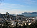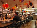 donderdag 14 november 2002Vandaag verkassen we nog een keer. Gisteren tijdens de wandeling door Lombard street zagen we veel motels en navraag gaf aan dat de prijzen acceptabel zijn. Zeker wanneer je de parkeerkosten verrekend. Dus om half tien checken we in bij Star Motel op nummer 1721. Vervolgens wandelen we op ons gemak naar downtown om het Metreon te bezoeken. De zon schijnt behoorlijk en we lopen in de schaduw om de warmte te vermijden. Het Metreon is een door Sony inc. opgezet warenhuis waar al hun producten verkocht worden. Om het aantrekkelijk te maken is er veel entertainment rondom heen geplaatst. Beneden bezoeken we de Discovery Channel Store. Op de tweede verdieping zijn games, muziek en computerzaken te vinden. We versturen daar b.v. een ter plaatse gemaakte foto van ons naar Boskoop. Op de derde verdieping zijn 15 bioskopen (de nieuwe van Harry Potter draait daar!). Het valt allemaal wat tegen. Het is nog lang niet af en het kits-gehalte is, zoals gebruikelijk in de USA, behoorlijk hoog. We zijn dus snel uitgekeken. Zelfs de lage koopdrempel van Andreh is hier tegen bestand. We eten wat in het cafe van het SFMOMA (museum of modern art) en gaan verder de stad door. We trekken dwars door het financial district. Hoge gebouwen met veel rokende mensen voor de deur. Dat roken mag tegenwoordig nergens meer binnen. Een winkelier had waarschijnlijk last van rokers die bij hem in het portiek kwamen schuilen. Bij hem stond: 'Absolutely no smoking within 100 feet' We beklimmen opnieuw een heuvel(tje) en bereiken Coit Tower. De tower is historisch gezien wel interssant maar visueel niet, deed het gisterenavond in het schemer stukken beter. Het uitzicht is wel mooi zo over de haven. We kijken, met een beetje lopen, 360 graden over San Francisco. Onderweg lopen we nog wat winkels binnen. Bij Radio Shack zien we een aanbiedinkje voor een DVD-speler: $59,-. Verderop in een grote film/muziekwinkel de limited edition (4 CD set) van deel 1 van The Lord of the Rings voor $29,-. Het kost hier soms echt weinig. We trekken richting ons motel en doen een stop voor wat nootjes en wat drinken en gaan daarna door om wat te eten. Dat doen we bij Mel's drive-in. Leuke tent, geheel ingericht naar de vijftiger jaren in de USA. Veel plastic en glimmend chroom. De bediening is overeenkomstig gekleed en uit de Juke-box komt muziek van b.v. Perry Como en De Marvelets. Hier hoort een hamburger bij.