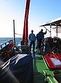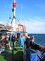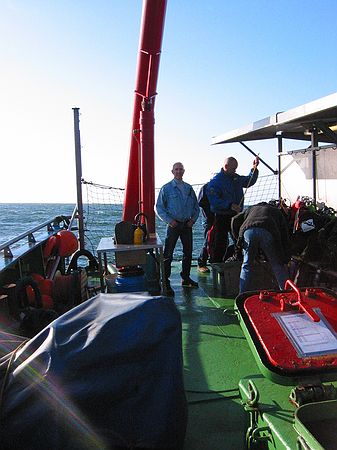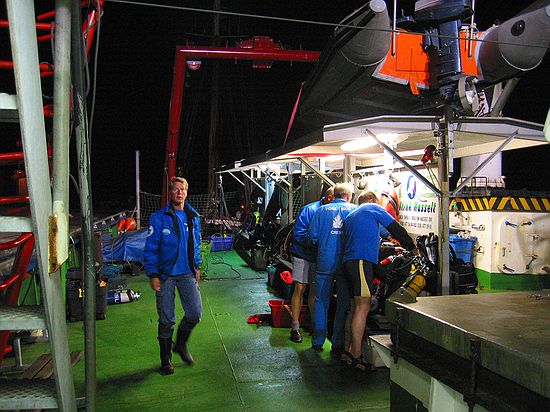 's Ochtends tegen vieren is de bemanning compleet, zijn alle andere duikers ook aan boord en vaart de Fogo Isle uit. Met wind en stroom tegen 'stampen' we de Noordzee op. Een goede kermisattractie zou zich er niet voor schamen en slapen valt niet mee. Ik kom regelmatig los van m'n matras, andere doen dat vrijwillig om op dek een 'frisse' neus te gaan halen.