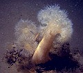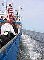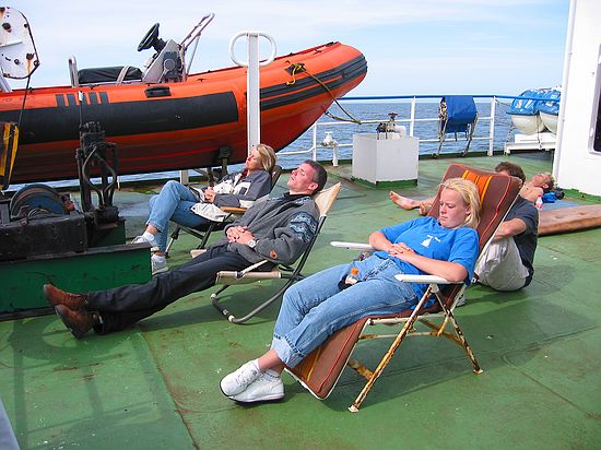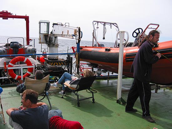 Na dit feestje onder water gaan we weer terug naar boven. Op 5 meter de gebruikelijke stop. Deze deden we vlak onder de hak van het schip. Het aan boord komen is nog een hele toer. De golfslag zorgt er voor dat de ladder het ene moment 5 en even later 12 treden heeft. De kunst is om op de top van de golf de ladder vast te pakken, dan ben je zo boven. Aan dek wordt je snel van je vliezen afgeholpen zodat je normaal kunt lopen en daar melden we ons ook weer aan boord. Deze pagina voor 't laatst bijgewerkt op 10 Jun 2003 |